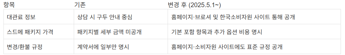 2025년 5월 1일부터 웨딩홀, 예식장, 스드메 업체들은 대관료(홀대여료) 스드메(스튜디오, 드레스, 메이크업) 패키지 가격을 공식적으로 공개해야 하며 특히, 한국소비자원 '가격정보사이트'를 통해 가격 정보가 제공되어 소비자가 한눈에 비교하고 확인할 수 있게 되었으며 숨겨진 추가비용 없이 사전 가격비교가 가능해진다는 점이 가장 큰 변화이니 잘 확인하시기 바랍니다.