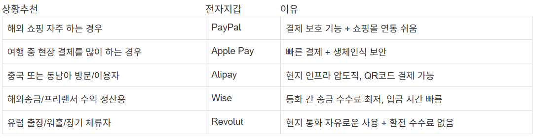 해외를 자주 이용하든, 온라인 쇼핑을 즐기든, 프리랜서 수익을 정산하든 글로벌 전자지갑 하나쯤은 반드시 필요한 시대가 되었으며 국내 전자지갑만 고집하지 말고, 자신의 목적에 맞는 글로벌 지갑을 활용해 시간과 돈을 절약하고, 보안까지 챙겨보세요!